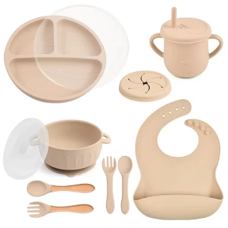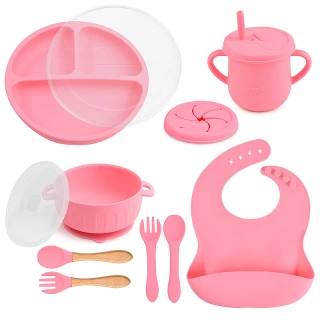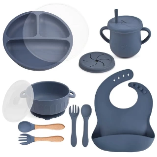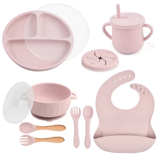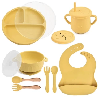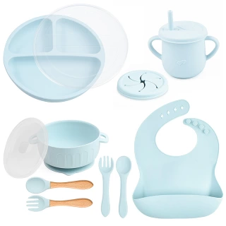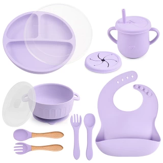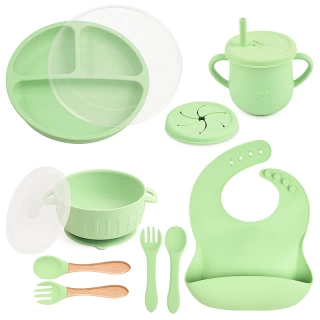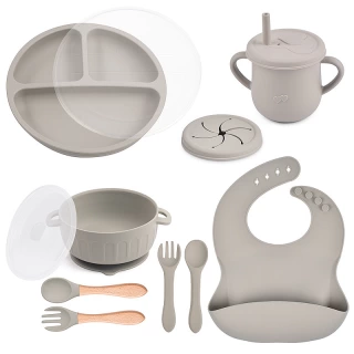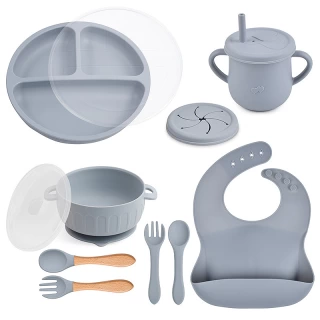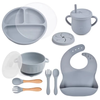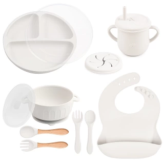 Essential tools: The set features a suction bowl with a lid, a divided suction plate with a lid, a cup with a straw and snack lid, 2 sets utensils, a bib with a food catcher.